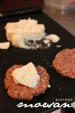 Blanda färsen med lök, äggula, salt och peppar. Forma 2 runda plattor til varje biff. Lägg osten på den ena och lägg den andra över, och tryck ihop sidorna. Linda baconskiva runt om. Stek biffarna gyllenbruna i stekpanna och lägg den sedan på ugnsfast fat och ställ in i ugnen i 200°C i 10 minuter. Sedan är det bara att njuta! Gott att servera lättstekta cocktailtomater och suger snaps till!