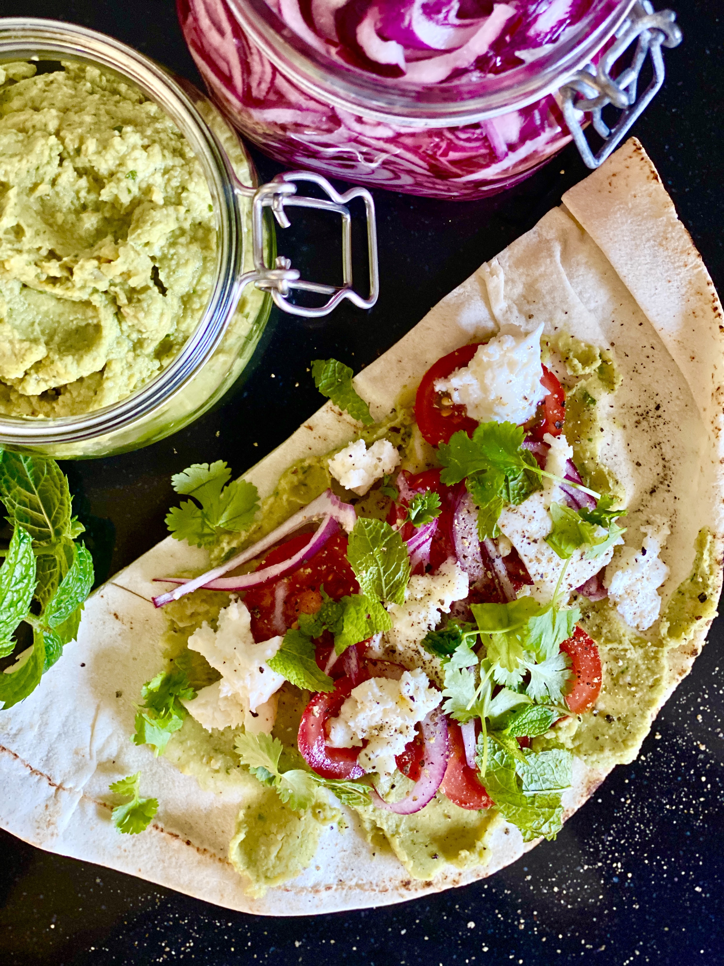 Bred avokadohummusen på libabröd. Lägg på tomater, mozzarella, picklad rödlök, mynta, koriander. Dra några varv med svartpepparkvarnen över allt. Vik ihop till en wrap och njut!