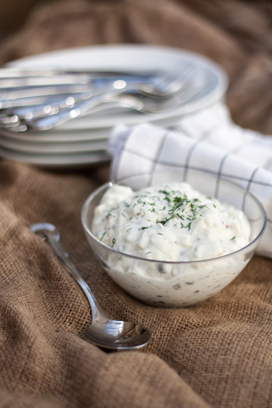 Hacka kaprisen. Blanda tillsammans med creme fraiche och majonäs.
