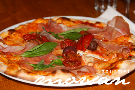 Husets tomatsås, mozzarellaost, svarta oliver, parmaskinka, marinerade soltorkade tomater och färsk basilika