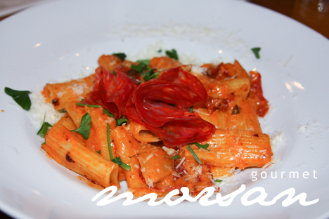 Färsk rigatoni (pastarör) i en krämig svampsås, gjord på Karl-Johan svamp och het salami från Calabrien, toppad med färskriven parmesanost, gourmèsalt, grovmalen svartpeppar och färsk persilja. Den här rätten ska jag absolut se om jag kan få till här hemma. Lovar att återkomma om jag lyckas