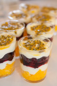 Smält chokladen i vattenbad eller i mikro. Tillsätt sockret och blanda med crème fraiche. Vispa snabbt ihop till en kräm. Skala apelsinerna och skär dem i bitar. Halvera och gröp ur passionsfrukterna. Varva frukt och bär ochkrämen. Toppa med passionsfrukt.