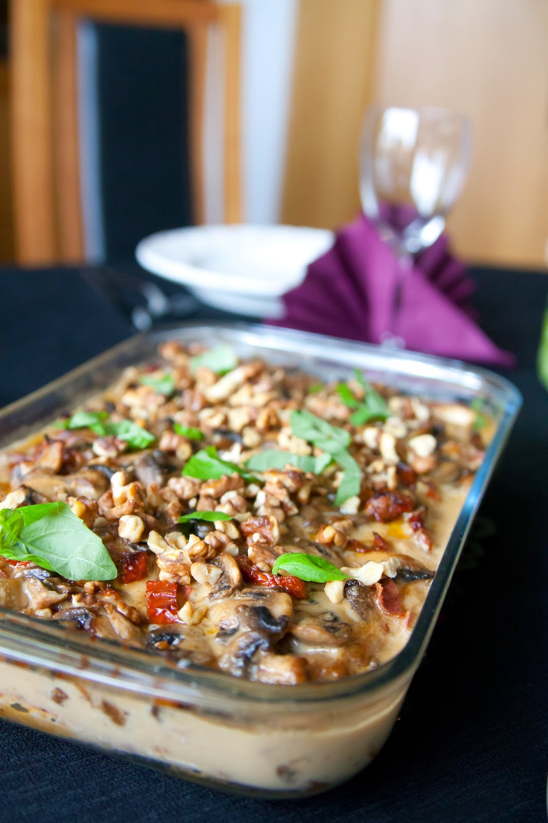 Skiva filéerna i  2 cm tjocka skivor och lägg i ugnsfast form. Varva kycklingen med skivad mozzarella och salami och strö över svampen över och hackade soltorkade tomaterna.