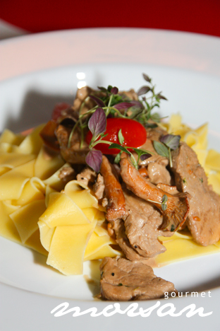 Gör så här: Skär köttet i skivor. Stek så det får fin färg och är genomstekta, och krydda med salt och peppar. Koka pastan enligt förpackningen. Slå på creme fraiche och grädde, kantarellfond och timjan. Till sist tillsätter du tomaterna, låt det puttra nån minut så de blir varma. Smaka av med salt, peppar och lite socker.