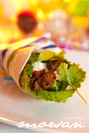 Servering: Värm bröden enligt anvisningen på förpackningen och fyll dem med kött, sallad, tomat, lök och gräddfil. Vira ihop till en strut och toppa med färsk koriander. Ge eventuellt rullen extra stöd med en servett.