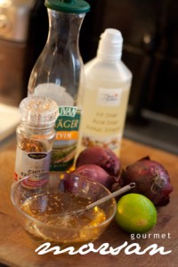 Blanda vinäger, sirap, pressad lime och krydda. Rör runt och tillsätt rödlöken. Låt stå i några minuter.