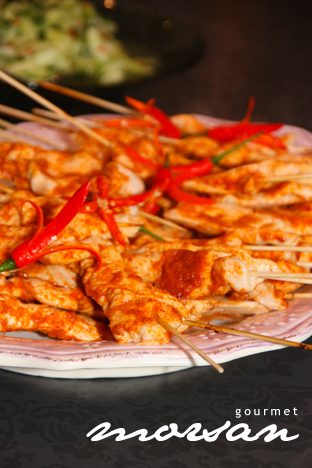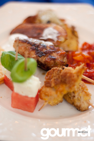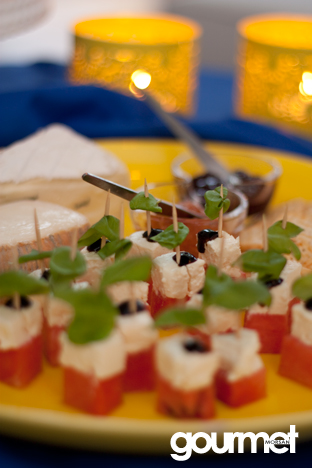 Servera med potatistärningar stekta med gul lök, lingon och gröna ärtor och kapriskräm. Toppa med en citronklyfta.