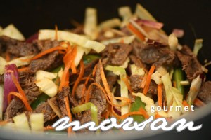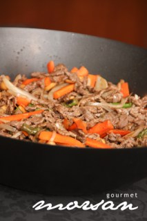 Bryn den strimlade biffen på hög värme i olja. Ta upp köttet, lägg åt sidan, woka grönsakerna på samma sätt. Tillsätt Wok Sauce och lägg tillbaka köttet i stekpannan. Värm under omrörning. Garnera med cashewnötterna, servera med ris eller nudlar.