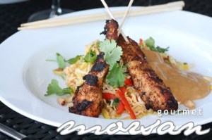 Blanda marinaden. Trä kycklingen på spett. Pensla på marinaden, grilla spetten i ugnen, 200°C ca 15 min, tills de fått fin yta. Värm Satay Saucen strax innan servering. Servera spetten med Satay Sauce och gurksallad (se recept) och garnera med hackade jordnötter.