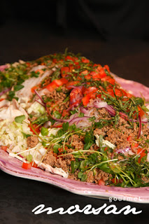 Stek köttfärsen och krydda med tunt skivad Lemongrass, Sriracha sauce och Fish sauce. Låt kallna. Laga nudlarna enligt anvisningen på paketet. Blanda ingredienserna till salladen. Lätt köttfärsen i mitten på ett fat med sallad runt om. |