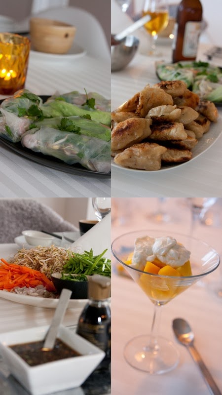 Här kommer en asiatistisk meny som svägerskan och svågern komponerat ihop inför nyårslunchen och som vi blev bjudna på. En lunch helt i min smak. Lätt, fräsch och underbart god. Så stort tack Anders och Jennie! Rätterna kräver ju lite arbete, det mesta som tar tid är allt som ska hackas, men det är det värt kan jag lova.