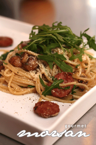 När pastan är klar häller man över den i stekpannan där såsen kokats.
