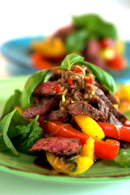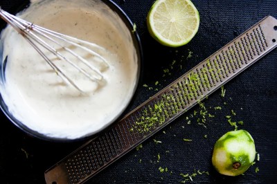 Wokad kyckling med strimlade grösnaker och kall limesås