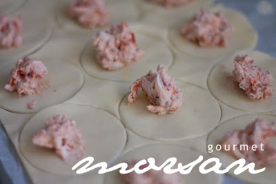 Ta ett runt mått och tryck ut i färsk smördeg. Klicka på en liten klick med fyllning.