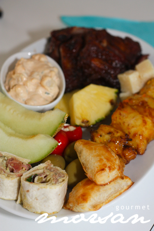 Men det kan det vara värt! Så blev det för oss i fredags! Kvällens tallrik blev fullpackad med grillade rev, kycklingspett, potatissallad, parmesanost, ananas, melon, oliver, Guacamolesnurror (se recept nedan), minipiroger med philadelphiaost och soltorkade tomater. Ja listan kan göras riktigt, riktigt lång… det är bara platsen på tallriken som säger stopp